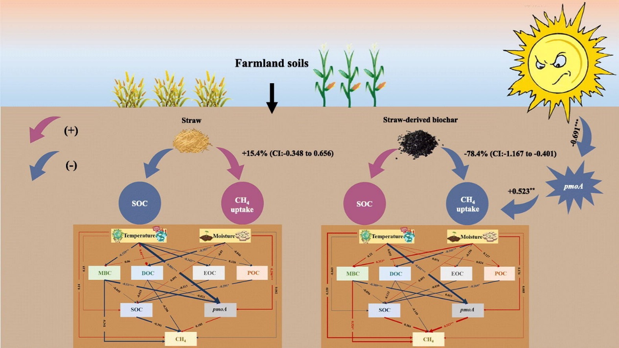 探明增溫與干旱對秸稈和生物炭改良農田系統土壤碳-甲烷反饋效應具有重要意義,但其交互作用仍需更全面的量化研究。通過整合培養試驗與全球Meta分析(105組觀測數據),本研究系統評估了增溫與干旱對不同碳改良土壤中甲烷氧化功能的影響路徑。結果發現,干旱通過協同削弱甲烷氧化功能(pmoA基因豐度)和微生物碳含量,使土壤 CH? 氧化量下降 58.9%,并削弱甲烷氧化的熱敏感性。增溫引發相反的甲烷匯響應,刺激秸稈粉碎還田土壤CH?氧化(增幅15.4%,CI: 0.348–0.656),削弱秸稈炭化還田土壤甲烷氧化活性(降幅78.4%,CI: 1.167–0.401)。增溫條件下土壤有機碳(SOC)含量呈現矛盾動態,短期損失和長期累積,凸顯了長期原位驗證的必要性。