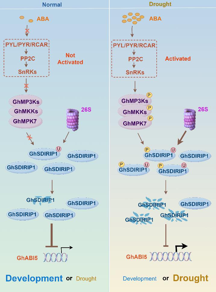 該研究發現,棉花C組MAPK,GhMPK7,在ABA介導的耐旱性中起到正調控作用。沉默GhMPK7轉基因棉花對干旱脅迫的抗性顯著降低。經過ABA處理后,沉默GhMPK7的轉基因植株對ABA不敏感,氣孔關閉受限,種子萌發速率更快,根更長。進一步的研究表明,ABA信號的負調控因子,GhSDIRIP1,與GhMPK7互作。在沉默GhMPK7的轉基因棉花植株中再沉默GhSDIRIP1,能夠恢復因GhMPK7沉默而導致的不耐旱表型。磷酸化實驗結果顯示,GhMPK7可以使GhSDIRIP1的第19位絲氨酸殘基磷酸化,從而調控其穩定性。GhMPK7誘導的GhSDIRIP1蛋白降解會增強植物在干旱脅迫下的ABA信號強度。該研究的結果揭示了GhMPK7-GhSDIRIP1模塊正調控ABA介導的植物抗旱性的調控機制。這項研究拓展了對MAPK級聯通路如何調節植物中ABA信號通路強度的認識,也加深了對磷酸化和泛素化之間相互作用的理解。