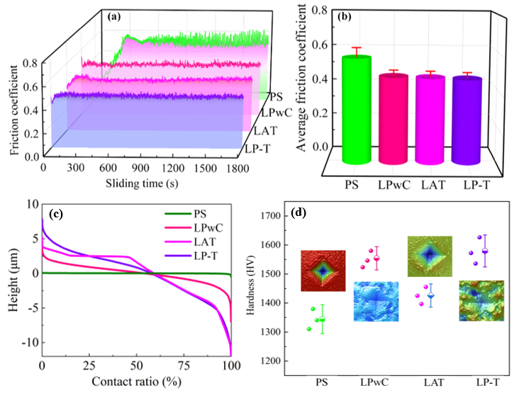 針對以上技術難題,團隊提出了一種結合激光噴丸和織構化加工的新工藝,在YG8硬質合金表面制備復合微織構。通過對試樣表面的微觀結構、粗糙度、硬度、殘余應力、摩擦磨損性能和切削性能的試驗研究,發現復合微織構表面展現出最優異的物理機械性能。該研究為硬質合金表面改性提供了新的思路和方法,通過優化表面特性大幅提升了硬質合金性能,有望在高性能切削工具和農機耐磨部件的制造中得到廣泛應用。