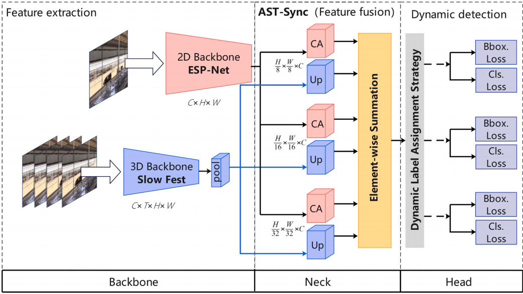 針對以上問題,團隊提出了一種基于巡檢機器人和時空特征融合算法(Cattle-ES3D)的肉牛呼吸急促和流涎行為檢測方法(圖1)。團隊首先提出了一種混合架構,將嵌入式空間金字塔網絡和SlowFast雙通路網絡集成在一起,實現肉牛行為時空特征的提?。黄浯?,設計了自適應時空特征融合同步模塊,實現時空特征的自適應融合;最后,設計了一個輕量級的動態檢測分支,通過時空動態標簽賦值驅動的多維參數優化機制,實現分類-回歸特征空間對齊和時間關聯約束。實驗結果表明,該方法具有時空特征,提高了肉牛呼吸急促和流涎行為的檢測精度,降低了計算成本。
