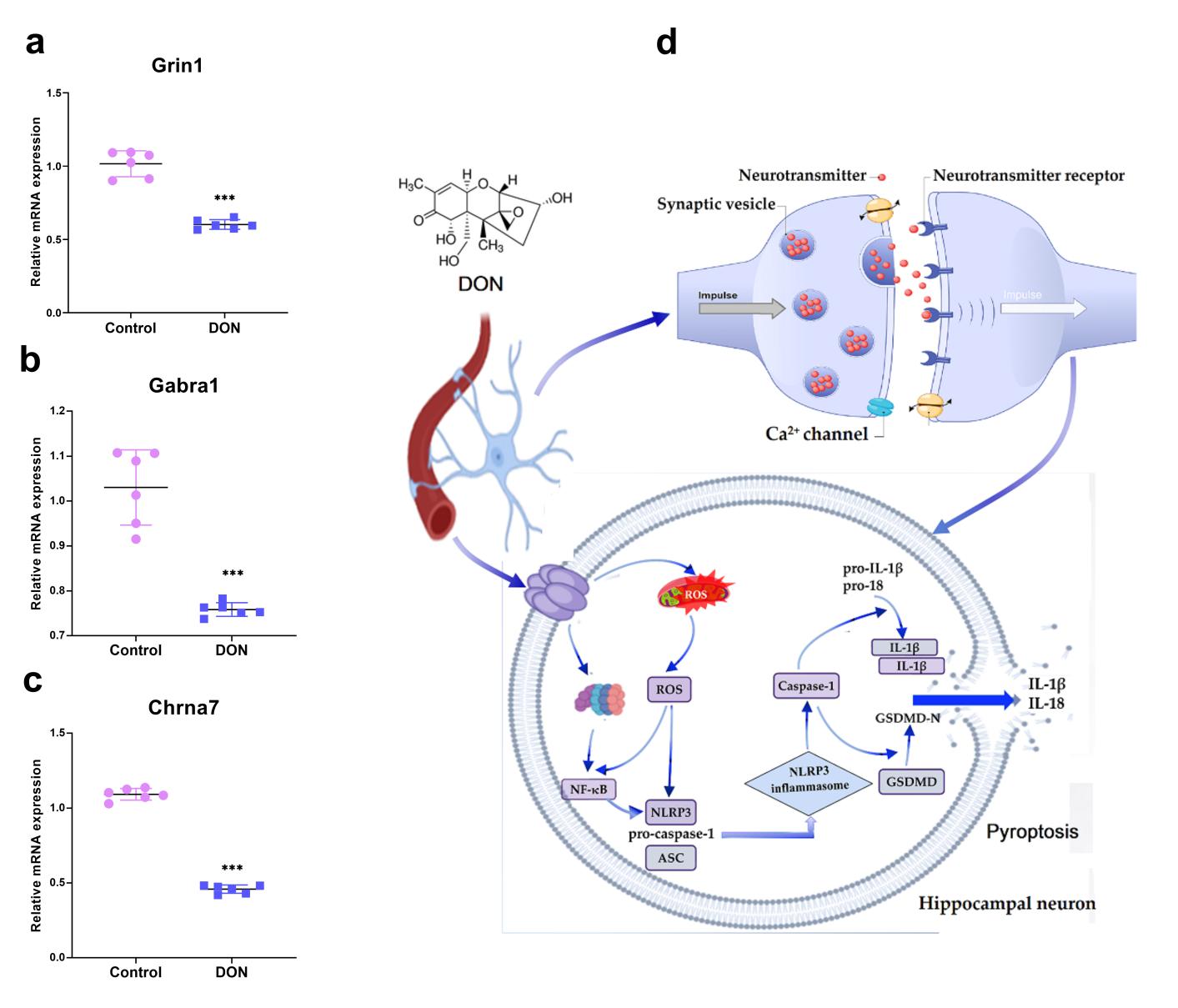 脫氧雪腐鐮刀菌烯醇(DON)是一種廣泛存在于小麥、玉米等谷類作物及飼料中的單端孢霉烯類霉菌毒素。該毒素可通過食物鏈對人類和動物健康造成嚴重威脅,引發(fā)包括腸道、肝臟及腎臟在內的多器官毒性反應。值得注意的是,DON能夠直接穿透血腦屏障,干擾神經系統(tǒng)的穩(wěn)態(tài)。近年來的研究表明,長期低劑量暴露于DON等霉菌毒素可能增加罹患神經退行性疾病的風險。鑒于神經退行性疾病與海馬體區(qū)域的免疫炎癥反應密切相關,海馬體可能成為DON誘發(fā)神經炎癥的關鍵靶器官。因此,本研究通過構建體外與體內實驗模型,系統(tǒng)探討DON誘導海馬神經細胞焦亡的作用機制。研究結果顯示,DON暴露可導致ROS過度生成,激活NF-κB信號通路,并上調NLRP3和ASC蛋白的表達水平,進而激活Caspase-1,促進炎癥因子IL-1β與IL-18的成熟與釋放,最終引發(fā)焦亡反應,造成海馬神經元損傷。此外,DON顯著干擾了海馬神經細胞中多種神經遞質的合成與釋放過程。相關性分析進一步表明,這些神經遞質的變化與阿爾茨海默病的發(fā)生密切相關,提示長期低劑量DON暴露可能是神經退行性疾病發(fā)展的重要風險因素。本研究不僅揭示了DON誘導海馬神經細胞焦亡的分子機制,還發(fā)現(xiàn)其對神經遞質穩(wěn)態(tài)的破壞作用,為深入解析DON的毒理機制提供了新的研究視角。抑制Caspase-1炎性體的活性,從而緩解DON引發(fā)的神經炎癥反應,可能成為一種具有前景的神經保護策略。