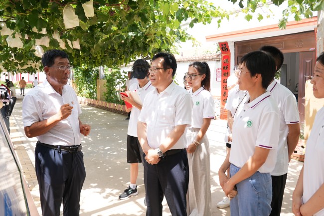 在萊西市日莊鎮(zhèn)溝東村,徐劍波詳細了解當?shù)剜l(xiāng)村治理、產(chǎn)業(yè)發(fā)展和推動鄉(xiāng)村振興情況,向當?shù)刭浰托滦娃r(nóng)用復(fù)合肥料,與專業(yè)教師一起開展技術(shù)指導(dǎo),助力當?shù)剞r(nóng)業(yè)生產(chǎn)。期間,徐劍波看望慰問正在該村開展“萬名學(xué)子聯(lián)萬村”暑期大調(diào)研活動的師生,并和他們座談交流。徐劍波指出,“萬名學(xué)子聯(lián)萬村”暑期大調(diào)研活動是學(xué)校開展主題教育、貫徹落實習近平總書記給中國農(nóng)業(yè)大學(xué)科技小院的同學(xué)們重要回信精神的有力實踐,也是推動科產(chǎn)教深度融合、服務(wù)農(nóng)業(yè)強省建設(shè)的有效舉措,希望在一線調(diào)研的同學(xué)與老師們一道,發(fā)揚“自找苦吃”的精神,將課堂知識與鄉(xiāng)村實踐緊密結(jié)合起來,扎實開展好大調(diào)研工作。同時積極推進科技服務(wù)驛站建設(shè),推動學(xué)校科技、人才、成果、技術(shù)等更快、更多的涌入鄉(xiāng)村一線,切實為農(nóng)業(yè)農(nóng)村發(fā)展作出應(yīng)有貢獻。他勉勵同學(xué)們要以本次活動為契機,扎根基層、了解農(nóng)村、了解農(nóng)民、了解農(nóng)業(yè)產(chǎn)業(yè),在實踐中厚植愛農(nóng)情懷,練就興農(nóng)本領(lǐng),努力成長為“一懂兩愛”的高素質(zhì)農(nóng)林人才,為農(nóng)業(yè)農(nóng)村現(xiàn)代化建設(shè)貢獻青春力量。