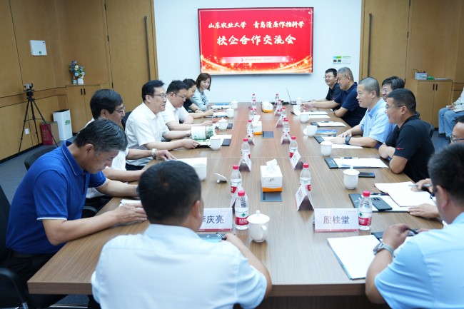 在青島清原作物科學(xué)公司,徐劍波走進公司展館、組培室、溫室大棚,詳細了解該公司在新農(nóng)藥創(chuàng)制、生物技術(shù)性狀開發(fā)和商業(yè)化育種等方面的建設(shè)發(fā)展情況。座談會上,徐劍波對企業(yè)的目標愿景、研發(fā)團隊建設(shè)以及取得的科研成就給予高度評價,對校企雙方的合作成果給予充分肯定。得知公司董事長連磊、總經(jīng)理莊潤青以及多名高管、多數(shù)員工均為學(xué)校校友,徐劍波非常高興,他向與會人員介紹學(xué)校深厚辦學(xué)底蘊和最新發(fā)展成就,并就小麥產(chǎn)業(yè)研究院、現(xiàn)代設(shè)施農(nóng)業(yè)產(chǎn)業(yè)研究院以及學(xué)校“沖一流”建設(shè)等方面的情況進行了深入交流。連磊介紹公司總體情況、發(fā)展規(guī)劃,他感謝學(xué)校多年來的悉心培養(yǎng)和對公司發(fā)展的支持幫助,希望進一步密切與學(xué)校的聯(lián)系與合作,在推動公司發(fā)展的同時,努力為一流農(nóng)業(yè)大學(xué)建設(shè)貢獻力量。