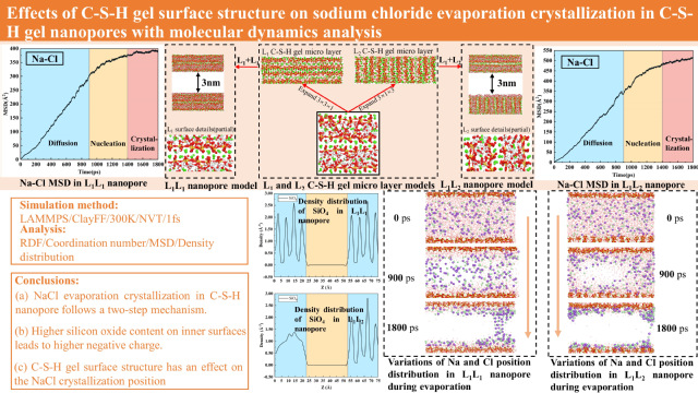 本研究基于C-S-H凝膠模型的短程有序性,提出了兩種晶向組合的固液界面模型,模擬并討論了C-S-H凝膠表面結構對NaCl溶液蒸發結晶過程的影響。NaCl在C-S-H凝膠納米孔道空間中的結晶遵循兩步結晶機制(成核和結晶)。鈉離子和氯離子在C-S-H凝膠表面的吸附存在顯著差異。C-S-H凝膠表面具有電負性,因此C-S-H凝膠表面對陽離子的吸附能力強于對陰離子的吸附能力,C-S-H凝膠表面對鈉離子的吸附更為穩定。C-S-H凝膠表面硅氧四面體密度的差異導致了C-S-H凝膠表面電荷特性的差異。C-S-H凝膠表面結構對氯化鈉結晶位置有影響,但對兩步蒸發結晶過程影響不明顯。這些發現為研究C-S-H凝膠表面的納米級特性和水泥基材料的宏觀耐久性提供了理論依據。