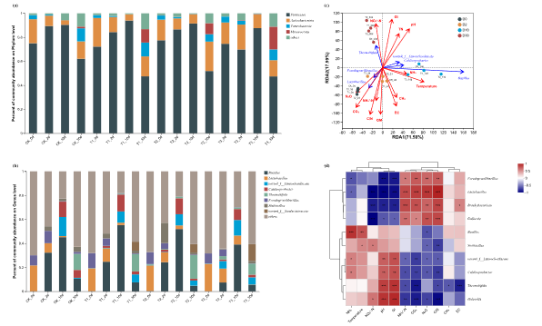 堆肥化過程中的優(yōu)勢菌門包括厚壁菌門(Firmicutes)、放線菌門(Actinobacteriota)、變形菌門(Proteobacteria)、擬桿菌門(Bacteroidota),優(yōu)勢菌中絕大多數(shù)與大分子有機物分解相關(guān),而芽孢桿菌屬(Bacillus)與氨氣排放顯著正相關(guān),乳桿菌屬(Lactobacillus)與氧化亞氮排放極顯著正相關(guān),假纖毛桿菌屬(Pseudogracilibacillus)、短桿菌屬(Brachybacterium)、葉癭菌屬(Gallicola)與氧化亞氮排放顯著正相關(guān)。
