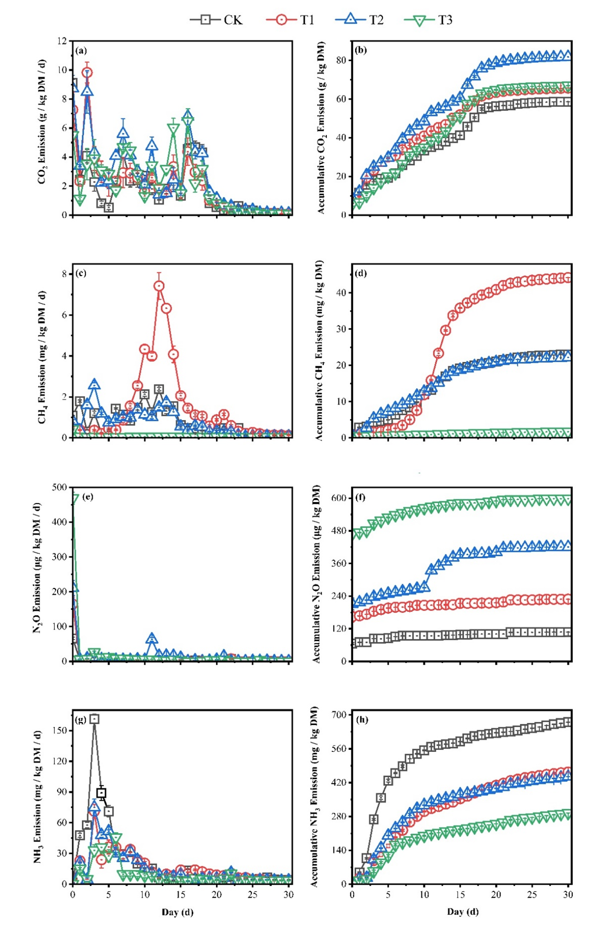 高溫堆肥是規(guī)模化養(yǎng)殖場畜禽糞便主要的處理模式,畜禽養(yǎng)殖廢棄物由于C/N比低、含水率高、透氣性差等,導(dǎo)致在堆肥化過程中不得不添加大量輔料,增加了堆肥的成本。秸稈、果木枝條、菌渣、鋸末等材料作為堆肥化工藝常用的輔料,難以實現(xiàn)持續(xù)穩(wěn)定收集,限制了連續(xù)堆肥化生產(chǎn)的推廣發(fā)展。同時,傳統(tǒng)堆肥化過程中會產(chǎn)生大量溫室氣體和臭氣,不僅污染大氣環(huán)境,而且導(dǎo)致堆肥養(yǎng)分損失。