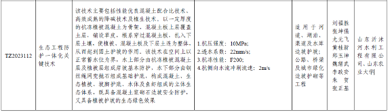 山東農業大學聯合山東沂沭河水利工程有限公司開展校企合作,在沂沭河流域開展科研合作與工程推廣應用,建立生態護坡工程項目多處,累計推廣面積5萬余平方米。該技術獲得國家發明專利2項,獲淮委科學技術獎,第二屆生態混凝土創新設計應用大賽二等獎,其主要性能指標有:抗壓強度10MPa,透水系數22mm/s,抗凍性能F200,抗側向水流沖刷流速2m/s。