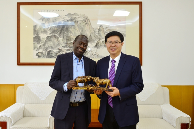 徐劍波對本杰明·切塞爾·切博伊郡長一行來訪表示熱烈歡迎,介紹了我省農(nóng)業(yè)發(fā)展?fàn)顩r以及我校辦學(xué)優(yōu)勢特色。他說,很高興在中肯兩國建交60周年之際,迎接郡長來山東農(nóng)業(yè)大學(xué)訪問,共同探討雙方深化合作。山東農(nóng)業(yè)大學(xué)一直秉承堅(jiān)持開放辦學(xué),在國際化辦學(xué)上進(jìn)行了不斷的探索。上世紀(jì)60年代,老校長陳瑞泰先生就把先進(jìn)的農(nóng)業(yè)技術(shù)帶到了非洲索馬里,造福當(dāng)?shù)厝罕姡蔀橹蟹呛献鞯囊欢渭言挕OMp方牢牢把握“一帶一路”建設(shè)的重大歷史機(jī)遇,以此次交流為契機(jī),進(jìn)一步加強(qiáng)人員往來、全面深化合作,為雙方經(jīng)濟(jì)社會發(fā)展和人民群眾幸福做出更大貢獻(xiàn)。