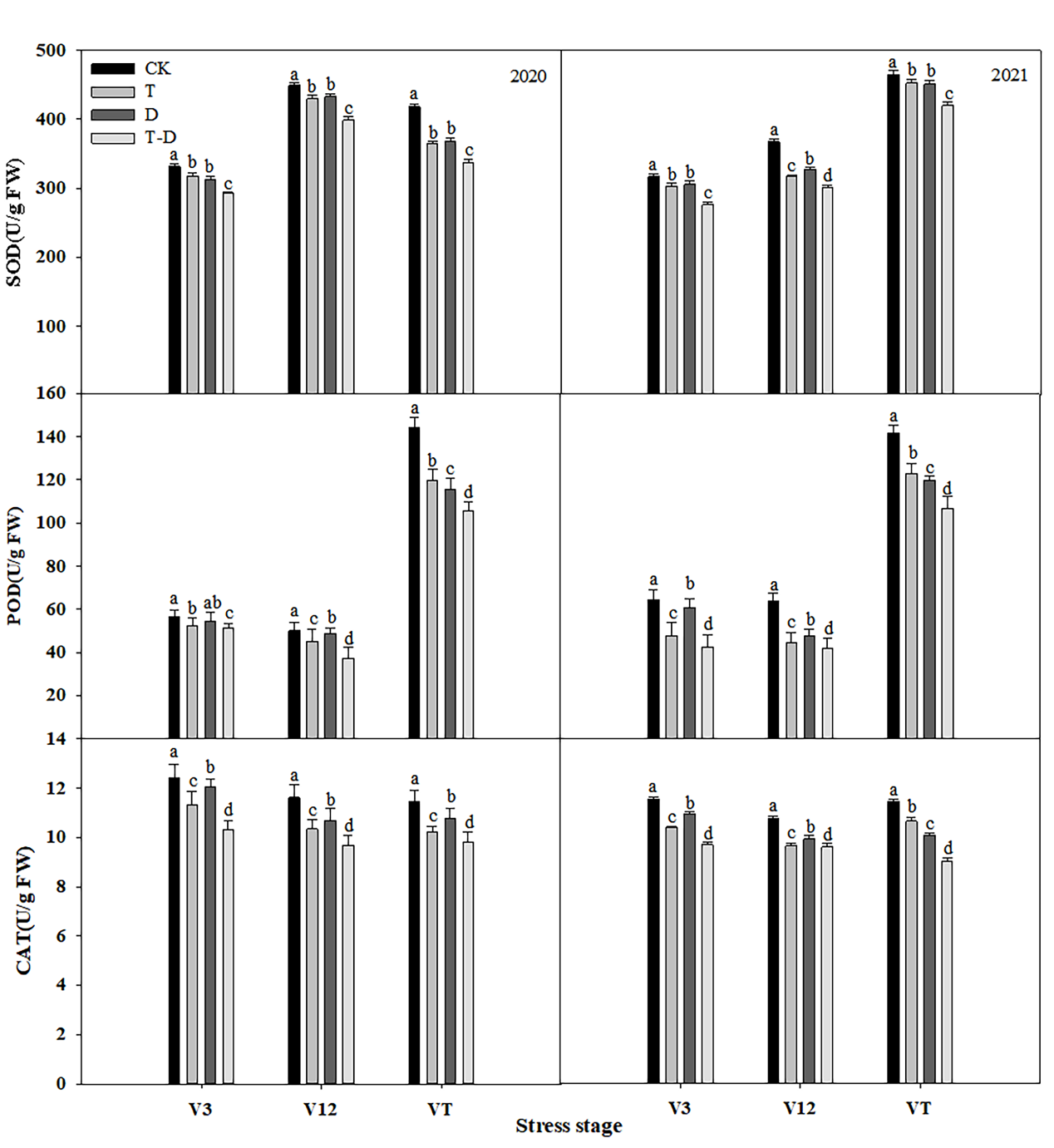 圖1 不同生育時期高溫、干旱及其復合脅迫對夏玉米抗氧化酶活性的影響