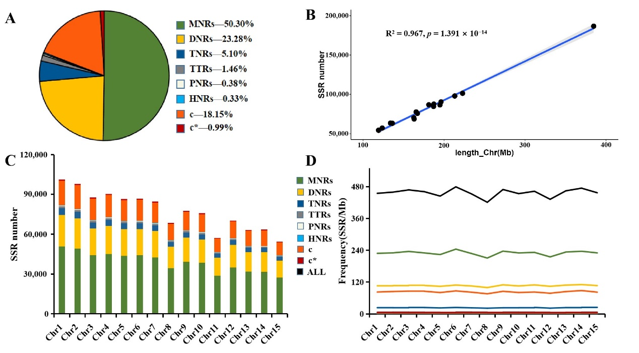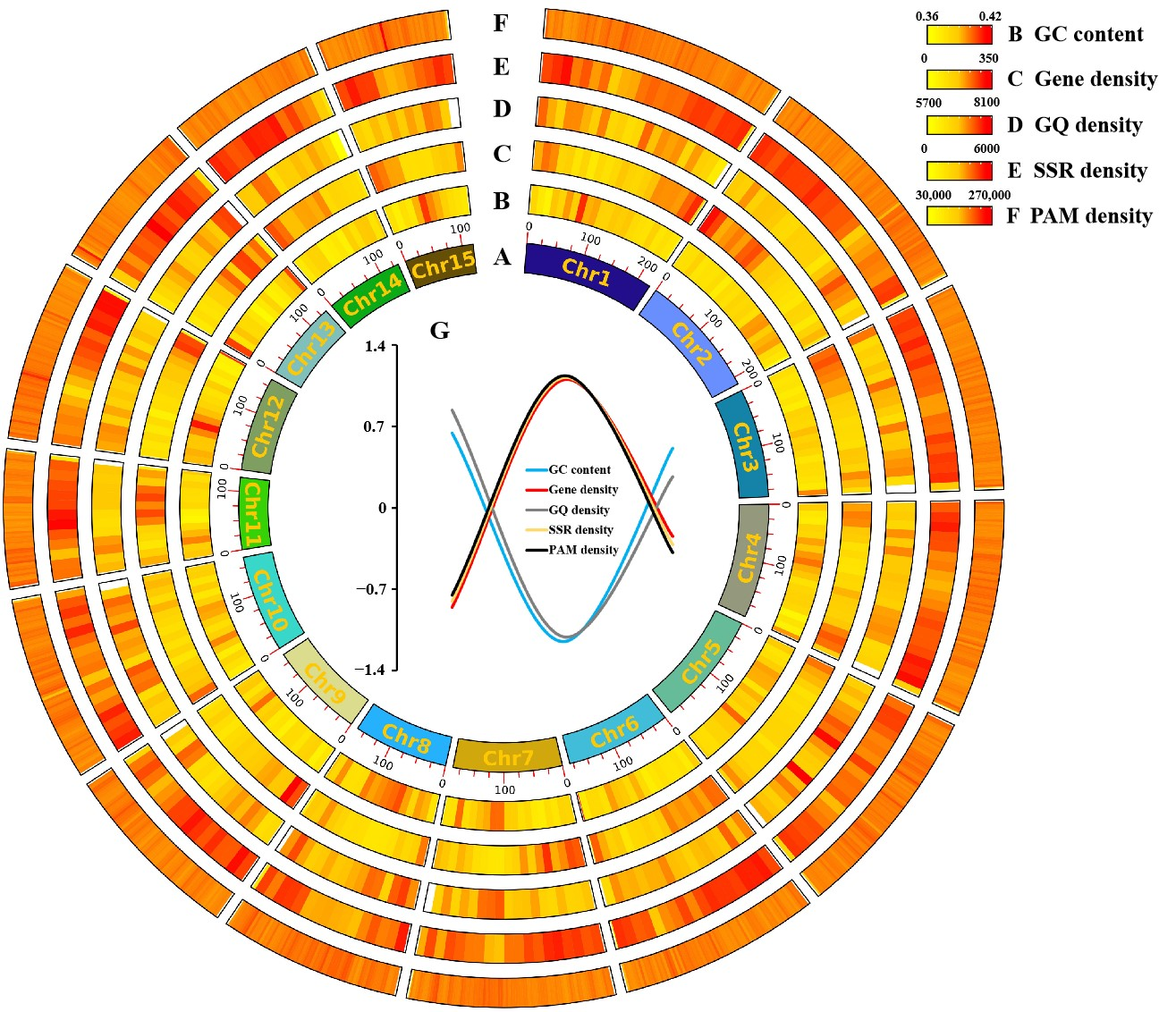 CRISPR/Cas9是一種高效的基因組編輯工具,茶樹基因組中編輯位點的鑒定及潛在影響因素尚未得到研究。在本研究中,利用生物信息學方法鑒定shuchazao基因組中包括編輯位點、simple sequence repeats (SSR)、G-四鏈體、基因密度的特征及其關系。在基因組中共鑒定了248,134,838個潛在的編輯位點,觀察到AGG、TGG、CGG、GGG、NGG五種PAM類型,其中66,665,912個被發(fā)現(xiàn)是有特異性的,它們存在于基因所有結構元件中。聯(lián)合分析中在染色體中發(fā)現(xiàn)了GC含量、GQ密度、PAM密度高相反基因密度、SSR密度低的特征區(qū)域,并發(fā)現(xiàn)該區(qū)域與次生代謝物和氨基酸生物合成途徑相關。所鑒定的編輯位點與影響元件SSR標記為茶樹功能研究和分子育種提供了有價值的工具,也給予了其他作物育種參考。