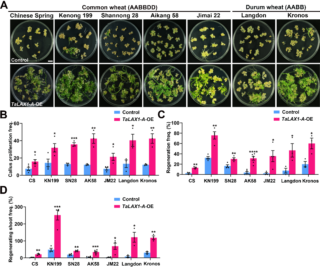 圖1.過(guò)量表達(dá)TaLAX1可以提高多個(gè)小麥品種再生能力
