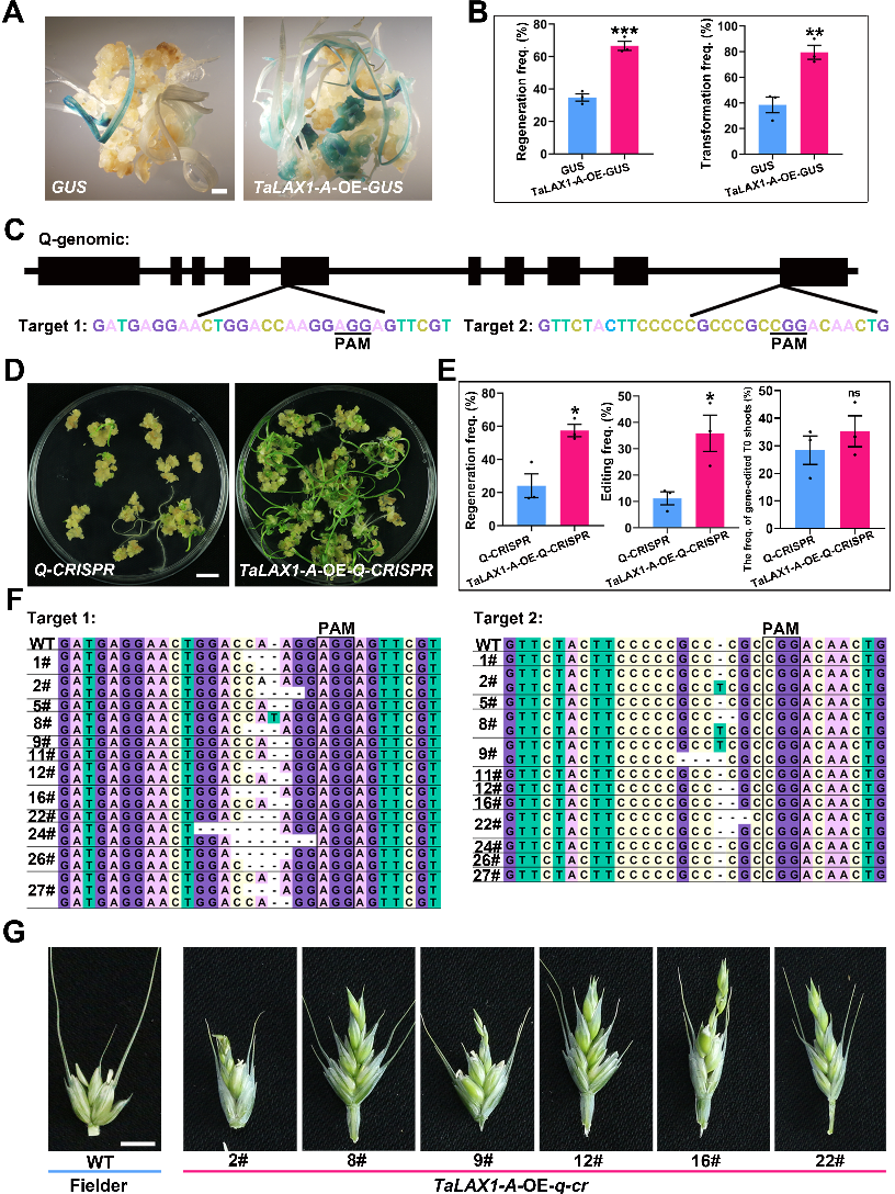 圖2. 過(guò)量表達(dá)TaLAX1提高遺傳轉(zhuǎn)化和基因編輯效率