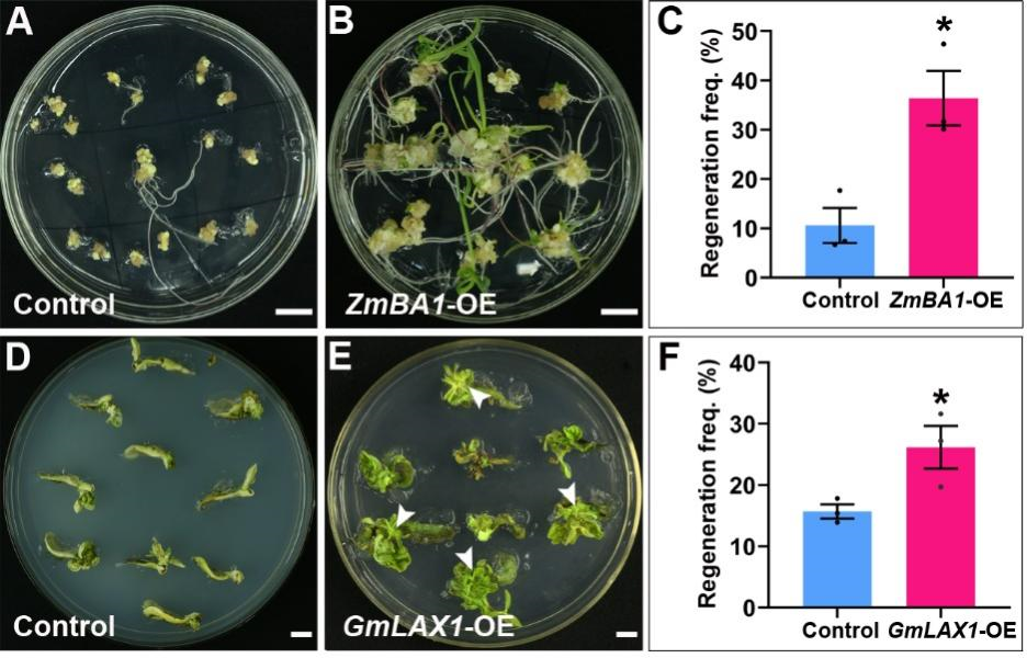 作者發(fā)現(xiàn)在玉米和大豆中過(guò)量表達(dá)TaLAX1的同源基因,存在保守的提高再生能力的效果(圖3)。
