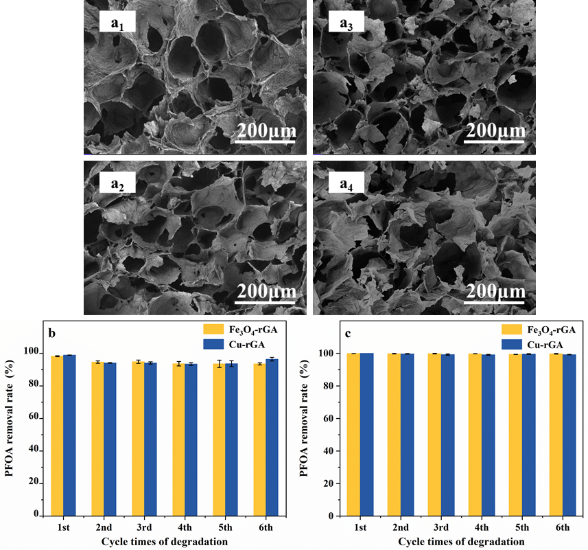 圖3. 改性氧化石墨烯氣凝膠多次電降解前后微觀形貌穩定性及PFOA去除率變化