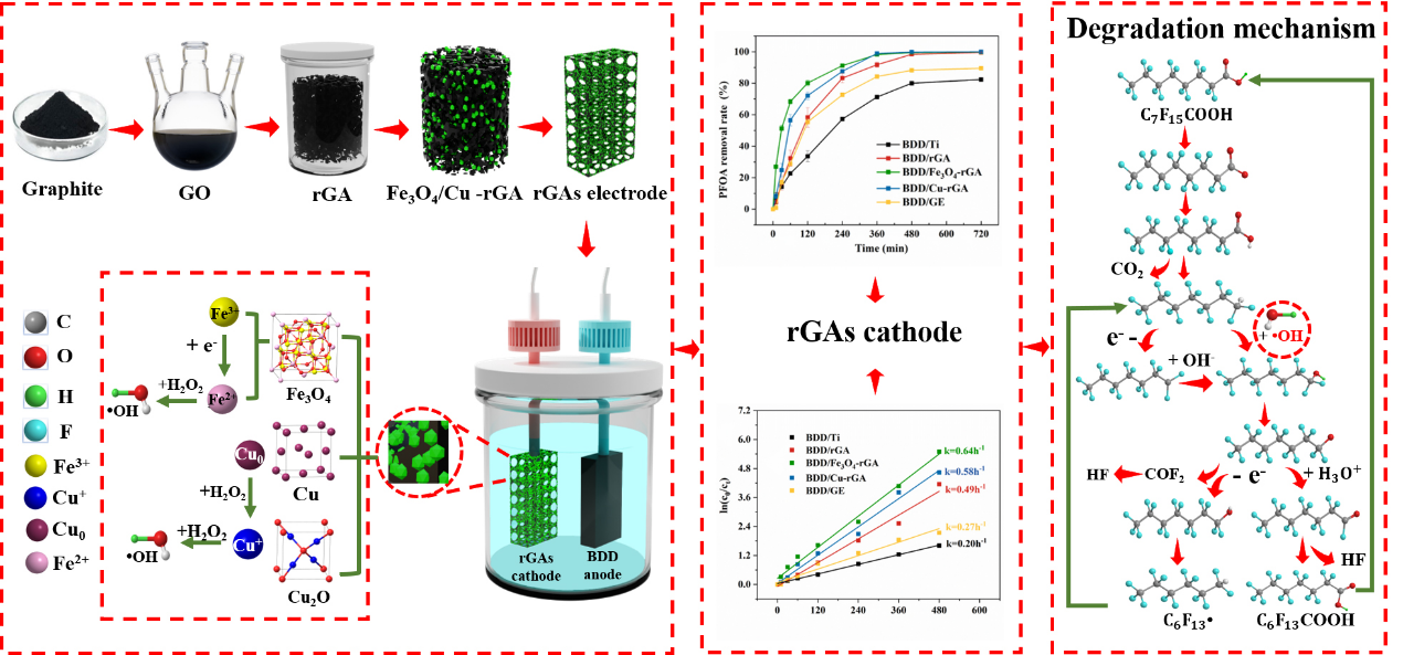 近日,山東農業大學資源與環境學院李成亮教授團隊在Chemical Engineering Journal在線發表了題為“Degradation of perfluorooctanoic acid (PFOA) using multiphase Fenton-like technology by reduced graphene oxide aerogel (rGAs) combined with BDD electrooxidation”的研究論文。碩士研究生李銀輝為該論文的第一作者,博士后劉娜博士和李成亮教授為該論文的共同通訊作者,山東農業大學為論文唯一完成單位。