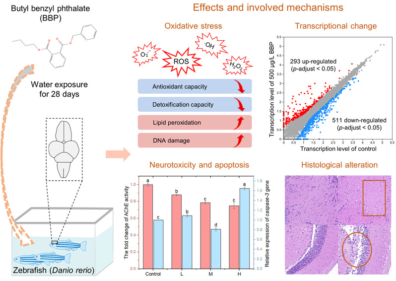 鄰苯二甲酸丁芐酯(BBP)是一類應(yīng)用廣泛的酞酸酯類增塑劑,目前已經(jīng)在各種環(huán)境介質(zhì)中被頻繁檢出,這引起了公眾的廣泛關(guān)注。本研究以成年斑馬魚(Danio rerio)為模式生物,分別從酶活性、基因表達(dá)和組織病理學(xué)等方面系統(tǒng)地解析了BBP對(duì)腦組織的生態(tài)毒理學(xué)影響。結(jié)果表明,BBP暴露能夠引起氧化應(yīng)激、神經(jīng)毒性和組織損傷,同時(shí)引發(fā)腦部轉(zhuǎn)錄組譜的改變,干擾補(bǔ)體和凝血級(jí)聯(lián)(Complement and coagulation cascades)以及兩種心肌病(Hypertrophic and dilated cardiomyopathy)相關(guān)通路的表達(dá)。
