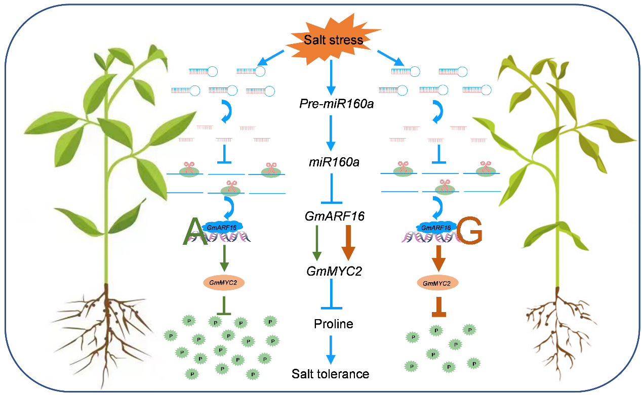 研究發(fā)現(xiàn),miR160a通過切割其靶基因GmARF16來提高大豆的耐鹽性。隨后,通過RNA-seq和ChIP-seq的聯(lián)合分析,并結(jié)合LUC和EMSA等實(shí)驗(yàn)結(jié)果,發(fā)現(xiàn)GmARF16作為上游調(diào)節(jié)因子直接激活GmMYC2的表達(dá),而GmMYC2通過負(fù)調(diào)控脯氨酸的合成導(dǎo)致大豆對鹽脅迫敏感。通過比較559份野生和栽培大豆品種的基因型,發(fā)現(xiàn)GmARF16存在4種單倍型,其中GmARF16H3在編碼區(qū)發(fā)生的堿基替換(G→A)使其對GmMYC2的激活能力以及與啟動(dòng)子結(jié)合能力顯著降低,對鹽脅迫的適應(yīng)性顯著提高;進(jìn)一步分析發(fā)現(xiàn),GmARF16H3主要分布在土壤鹽堿化較為嚴(yán)重的黃淮海及其周邊地區(qū),表明GmARF16的自然變異受到了人工選擇。