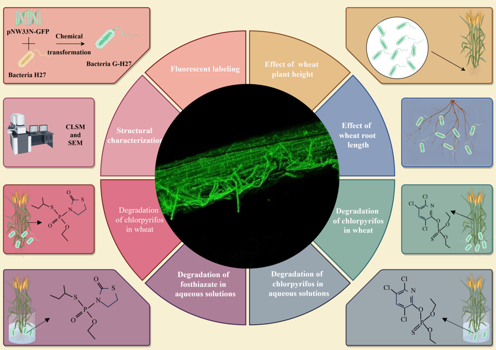 殘留在農業(yè)環(huán)境中的有機磷農藥對農作物質量、人類健康和生態(tài)環(huán)境具有一定風險,如何消減環(huán)境中的有機磷農藥并阻止其向農作物遷移具有重要意義。目前,微生物修復是最具發(fā)展和應用前景的生物修復技術,微生物可通過形成生物膜增強其生物功能,強化污染修復效果。本研究通過構建熒光標記蠟樣芽孢桿菌G-H27(Bacillus cereus),基于熒光標記菌G-H27的生物膜建立了毒死蜱和噻唑膦高效降解體系,探究了該菌通過定殖和成膜對小麥根表毒死蜱和磷噻嗪的去除效果。