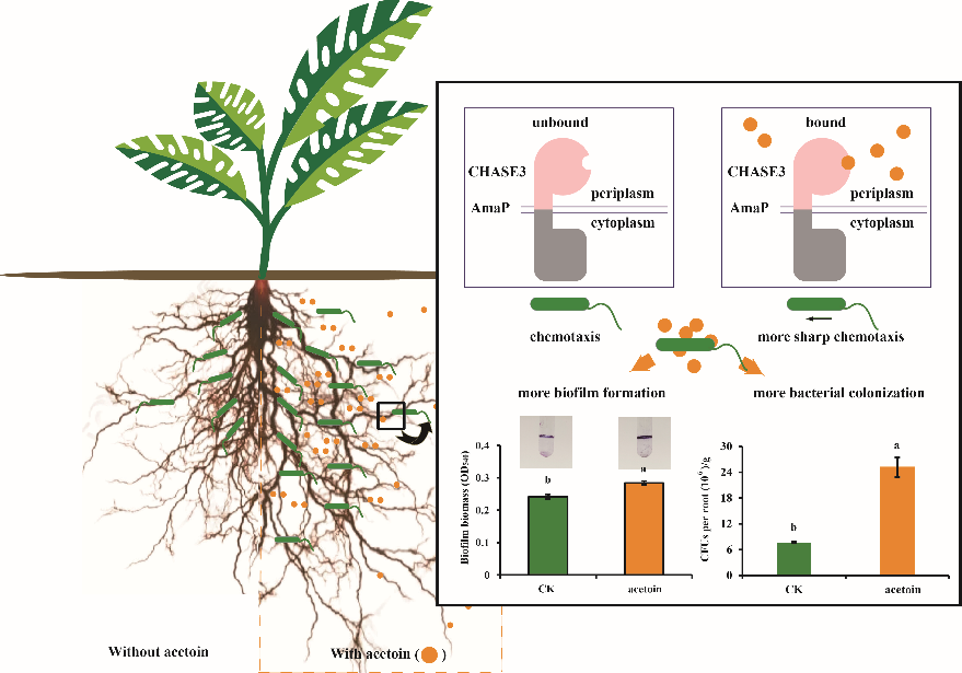 揮發(fā)性有機(jī)化合物(VOC)是一類由土壤細(xì)菌產(chǎn)生的低分子量親脂性氣態(tài)化合物,能夠在土壤環(huán)境中快速擴(kuò)散。已知微生物VOC在提高植物抗逆性、促植物生長(zhǎng)、改善細(xì)菌適應(yīng)性和調(diào)控土壤微生物組成等方面具有重要作用。此外,根際揮發(fā)性的分子還在其中介導(dǎo)植物與相關(guān)微生物之間的信號(hào)傳導(dǎo)。乙偶姻(3-羥基丁-2-丁酮),可以被大多數(shù)微生物產(chǎn)生,是主要VOC之一。迄今對(duì)微生物VOC的研究工作多局限于種類鑒定,對(duì)植物的促生功能;然而,微生物VOC對(duì)根際促生菌的生理變化和與其宿主植物的共生有關(guān)的機(jī)制仍不清楚。