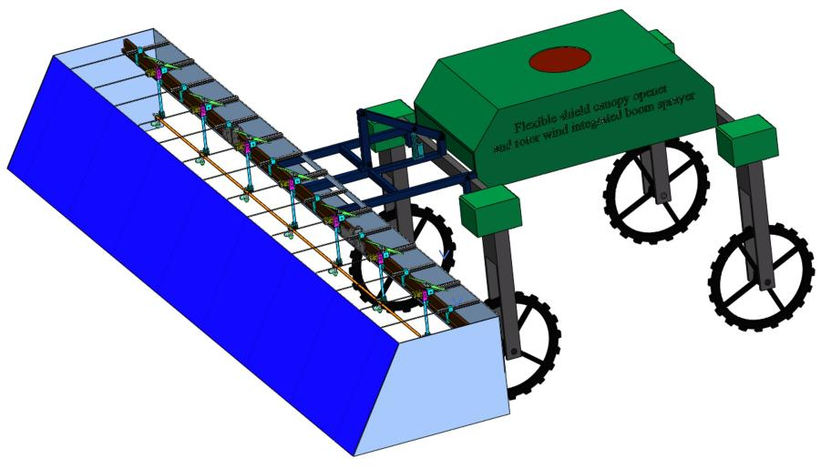 圖2 新型柔性罩蓋開冠器與旋翼風送一體化噴桿式噴霧機三維圖