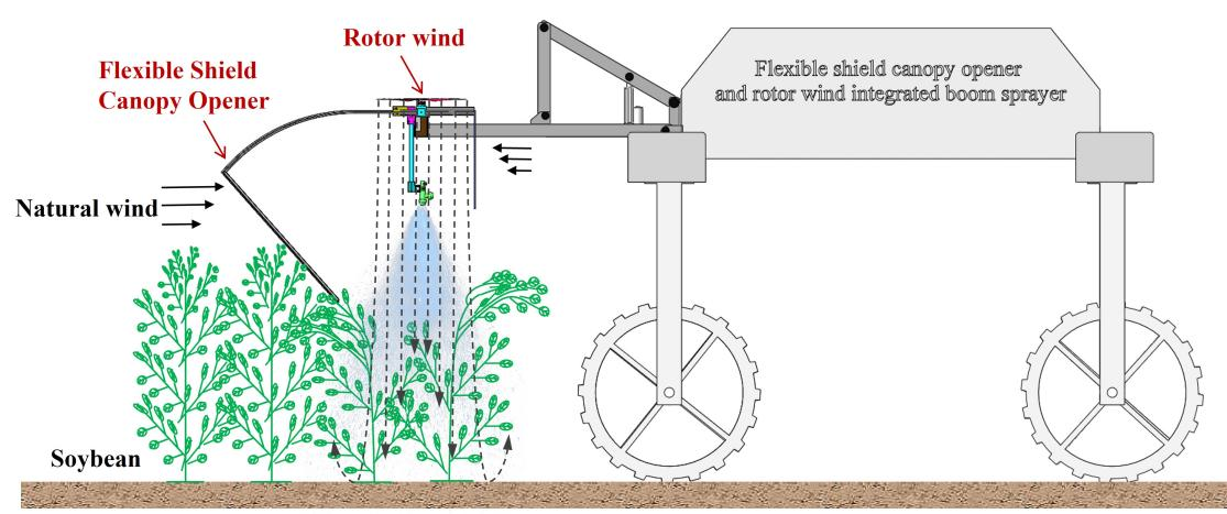 因此,針對傳統(tǒng)噴霧方法存在的問題,該團隊提出了一種融合柔性冠層開啟器、旋翼風送和防護罩于一體的新型噴施方法(圖1)。設計并搭建了一種新型柔性罩蓋開冠器與旋翼風送融合式噴桿噴霧機(圖2)。對比分析了不同噴霧模式下大豆葉片正面和背面的霧滴覆蓋均勻度指數(shù)。構建了大豆冠層噴霧效果綜合評分模型,確定了最佳噴霧模式和噴霧參數(shù)。在最優(yōu)噴霧參數(shù)下,對新型柔性罩蓋開冠器與旋翼風送融合式噴桿噴霧機的霧滴防漂移性能進行了測試。