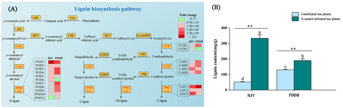 圖2. 小貫小綠葉蟬取食對‘黃金芽’和‘福鼎大白茶’木質素通路的影響