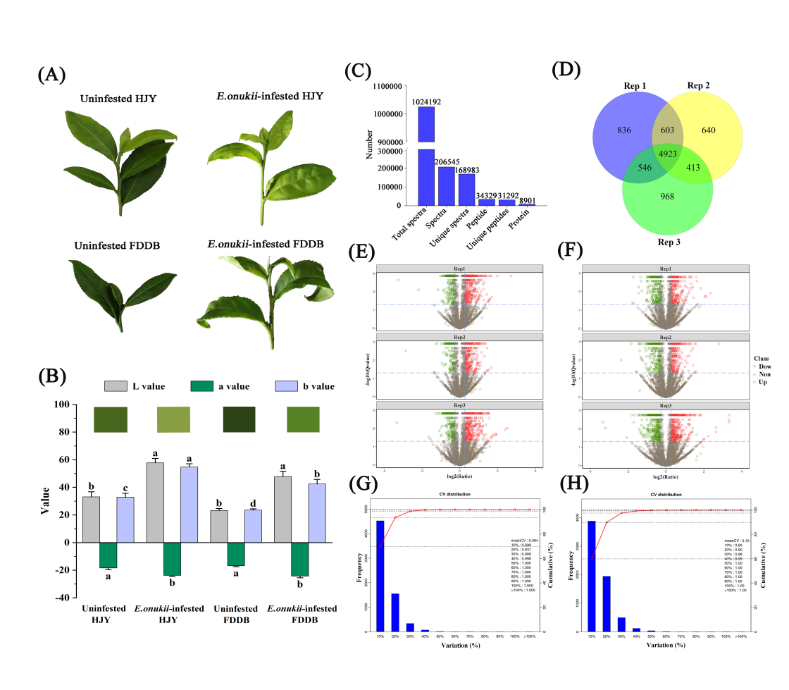 結合團隊前期研究發現,被葉蟬取食的‘黃金芽’與健康茶樹相比葉色變為淺黃色,葉片外圍皺縮卷曲且被為害的新芽節間縮短。與對照相比,受葉蟬取食的‘福鼎大白茶’被害芽尖生長受阻且葉片失去光澤。通過對蛋白組數據的全面篩選,我們在小貫小綠葉蟬取食后的‘黃金芽’和‘福鼎大白茶’中發現了168983個特異性光譜、31292個特異性肽和8901個蛋白質。通過對蛋白功能鑒定分類后發現差異蛋白主要參與植物脅迫防御、光合作用、碳水化合物利用和蛋白質降解等生理過程。