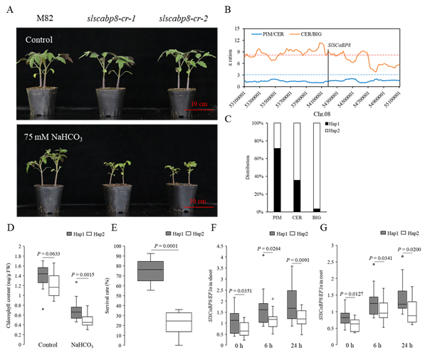 研究首先發現,番茄自然群體中醋栗番茄、櫻桃番茄和栽培番茄的鹽堿脅迫抗性逐步降低,說明鹽堿抗性在番茄的馴化和改良過程中發生衰退。對醋栗番茄LA1589與栽培番茄E6203漸滲系群體的鹽堿抗性進行篩選,發現漸滲系Pi-75比E6203具有更強的鹽堿抗性,該漸滲系包含鈣結合蛋白SlScaBP8位點。通過遺傳學和生化手段,證實SlScaBP8是鹽堿脅迫抗性的正調控因子。LA1589與Pi-75中鹽堿脅迫誘導SlScaBP8的表達水平顯著高于E6203,而氨基酸序列在醋栗番茄與栽培番茄之間沒有差異,這說明啟動子區的變異導致SlScaBP8表達水平的變化,這可能是醋栗番茄與栽培番茄鹽堿抗性差異的原因之一。通過群體基因組學分析,發現SlScaBP8在番茄改良過程中受到選擇。進一步分析發現,SlScaBP8啟動子區存在8個SNP和1個InDel,只有SNP7位于一個NAC類轉錄因子結合基序中。基于SNP7的單倍型分析發現,具有野生單倍型的自然群體材料鹽堿抗性顯著高于栽培單倍型的材料,野生單倍型材料中SlScaBP8的鹽堿誘導表達水平顯著高于栽培單倍型的表達水平。綜上所述,SlScaBP8啟動子區的自然變異,導致醋栗番茄和栽培番茄之間SlScaBP8鹽堿誘導表達水平的變化,進而導致其鹽堿抗性的差異。
