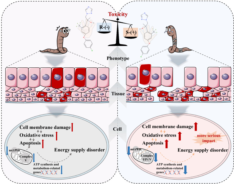 課題組以土壤為主要匯的新型手性農藥氯氟醚菌唑為研究對象,通過整合多生命層次傳統毒性終點和轉錄組學,探究了氯氟醚菌唑對映體對土壤模式生物赤子愛勝蚓的毒性效應及分子機制。研究結果表明氯氟醚菌唑對映體對蚯蚓的亞慢性毒性具有立體選擇性,而線粒體功能障礙的差異是這種選擇性的關鍵。具體表現為:與R-(-)構型相比,S-(+)構型特異性上調線粒體細胞組分,并鑒定出更嚴重的線粒體裂變;此外,S-(+)異構體更顯著的下調ATP合成和代謝相關生物過程,特異性抑制線粒體呼吸電子傳遞鏈復合物I和IV的活性,導致更嚴重的電子流紊亂。這種供能障礙的差異最終介導了立體選擇性個體發育過程受阻。本研究可為氯氟醚菌唑有害結局通路的構建提供系統的支持數據,也為手性農藥環境毒理學機制的研究提供參考方法。在指導氯氟醚菌唑高效和安全利用角度,雖然R-(-)構型對蚯蚓具有更高的安全性,但推薦使用R-(-)單體應基于對更廣泛物種的風險評估和對生態風險降低所帶來效益的總體評估。