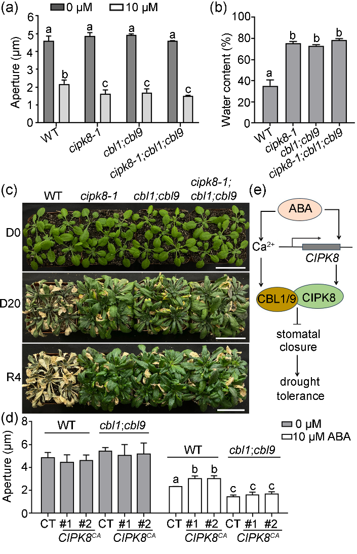 圖1. CIPK8通過CBL1和CBL9介導(dǎo)ABA誘導(dǎo)的氣孔關(guān)閉