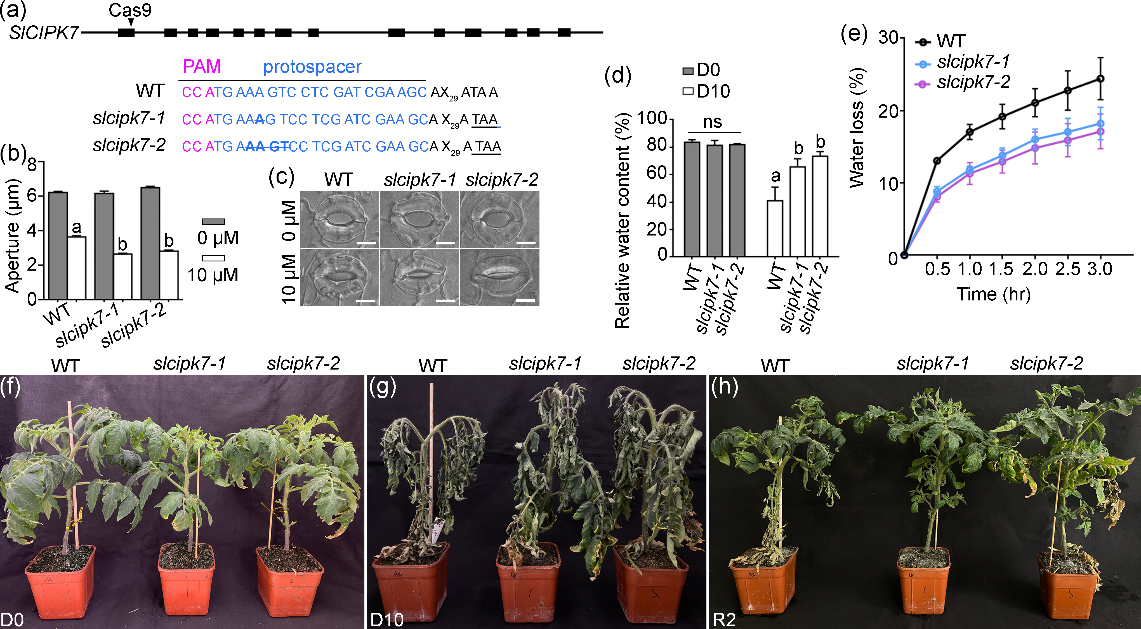 課題組進(jìn)一步研究證明了,番茄(Solanum lycopersicum)中的SlCIPK7是擬南芥CIPK8的同源蛋白,利用CRISPR/Cas9基因組編輯技術(shù)以SlCIPK7基因組為靶點(diǎn)創(chuàng)制了耐旱番茄,為番茄育種提供了寶貴的種質(zhì)資源。